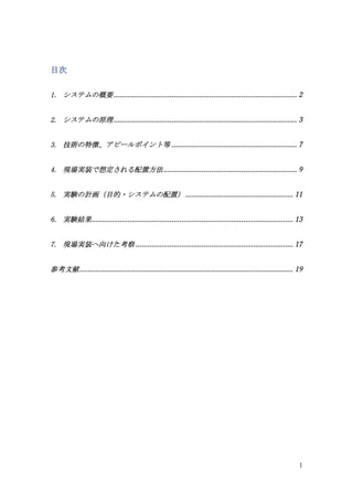 システムの原理............................................................................................ 3 3. 技術の特徴、アピールポイント等 ............................................................... 7 4. 現場実装で想定される配置方法................................................................... 9 5. 実験の計画(目的・システムの配置)...................................................... 11 6. 実験結果..................................................................................................... 13 7. 現場実装へ向けた考察 ............................................................................... 17 参考文献........................................................................................................... 19