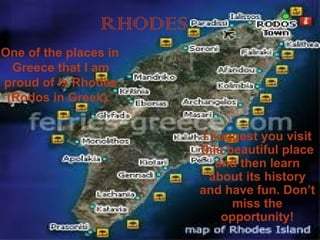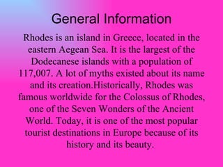 Rhodes is a large Greek island in the Aegean Sea known for its history and natural beauty. There are many historical sites to visit including the Acropolis of Lindos, the medieval city of Rhodes Old Town, and the ruins of the Colossus of Rhodes. Beaches like Faliraki are popular for tourism, along with resort towns throughout the island. The island has a mix of historical sights, natural attractions like the Valley of the Butterflies, and entertainment options to keep visitors busy.