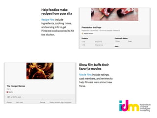 The document advertises a 10% discount on selected training courses from the IDM academy. It provides the website and social media accounts for the IDM where more details on the offer can be found. The second half appears to be an agenda for a presentation on properly using Pinterest, covering topics such as high traffic generation, referral sites, addictive behaviors, and strategies for brands. The document promotes a special offer for training courses and an upcoming presentation on using Pinterest effectively.