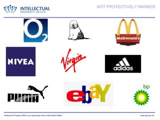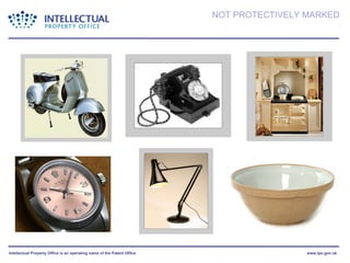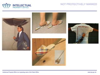 - The presentation discusses trademarks, registered designs, patents, and copyright - what they protect, requirements for registration, fees, and duration of protection. It emphasizes the importance of intellectual property for businesses.