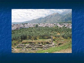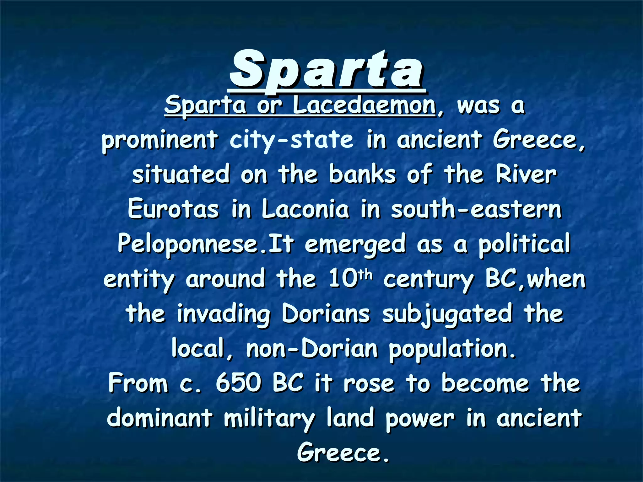 Sparta emerged as a political entity in ancient Greece around the 10th century BC when invading Dorians subjugated the local population. It was situated on the banks of the Eurotas River in Laconia in southeastern Peloponnese. Sparta rose to become the dominant military land power in ancient Greece from around 650 BC. The majority of modern Sparta's population still lives in the town, which is famous for its olive trees and citrus processing, located on the site of Ancient Sparta as designated by King Otto in 1834.
