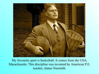 The document discusses the author's favorite sport, basketball. It notes that basketball was invented in the US by James Naismith and the best team was the Dream Team featuring Michael Jordan and Magic Johnson. The author plays basketball three times a week and likes their local team ANWIL, who were Polish champions in 2002. Their favorite NBA player is Kevin Durant.