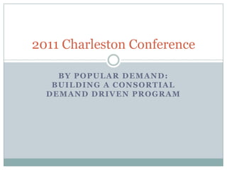 This document summarizes a presentation about a demand-driven acquisitions program for ebooks implemented by the Orbis Cascade Alliance. It discusses the goals, funding model, collaboration structure, workflow, communication efforts, and evaluation of the pilot program. Key aspects included leveraging vendor relationships, providing consortium-wide access, establishing an equitable funding model, and evaluating usage and return on investment. Challenges involved managing expectations, developing a sustainable workflow, and ensuring clear communication throughout the project.