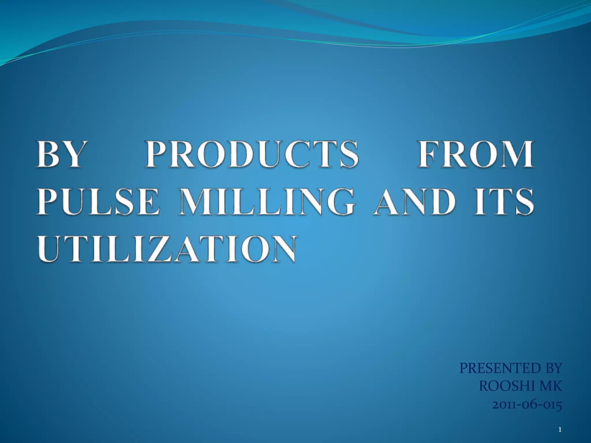 Pulses are rich in proteins and are mainly consumed after milling, which removes the outer husk and splits the grain. Byproducts of milling include husk, peel, germ, and brokens. Dry milling produces brokens that can be used to make ready-to-fry snacks by cleaning, powdering, sieving, seasoning, kneading, cooking, and extruding. The husk can be used for solid state fermentation to produce tannin acyl hydrolase using red gram husk through inoculation, fermentation, extraction, immobilization, and purification by chromatography. Other byproducts include papad mixes, flour mixes, and animal/cattle feed produced through various preparation