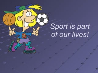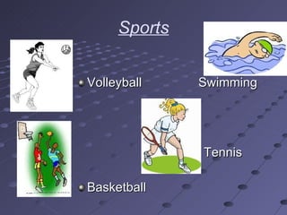 This document discusses the importance of sports in people's lives and maintaining a healthy lifestyle. It lists several sports like volleyball, swimming, tennis, and basketball. It also mentions that sports can result in wins, satisfaction, and tears of happiness. The document recommends eating fruits and vegetables, jogging, and limiting sweets. It briefly discusses types of lung conditions and lists favorite Polish athletes Adam Małysz and Justyna Kowalczyk who have won many prizes.