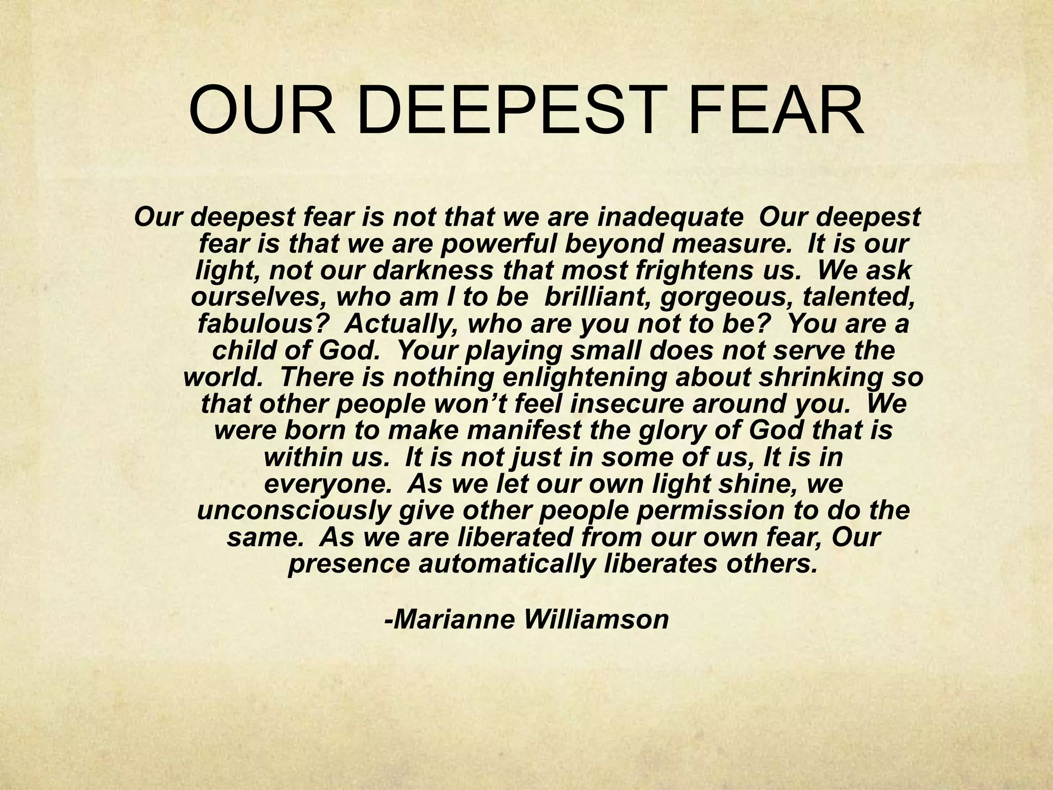 Our deepest fear is not inadequacy but that we are powerful beyond measure. We were born to manifest the glory of God within us, which is present in everyone. As we let our own light shine and overcome our fears, we unconsciously give others permission to do the same and liberate them from their own fears. The document then provides 10 tips for youth to become change agents, including daring to dream big, setting goals, seeking opportunities through research and networking, embracing criticism, exploring options, and staying motivated.