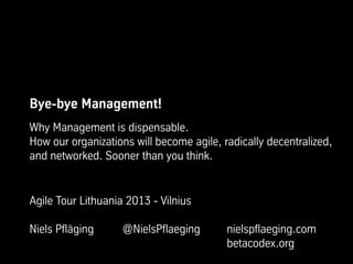 This document discusses why management is becoming dispensable and how organizations will become more agile and decentralized. It argues that under the right conditions, people enjoy and are motivated by work, seek responsibility, and have creativity that is underused. Traditional hierarchical management structures are described as mechanical and dividing work from thinking. Alternative structures are proposed that integrate thinking and doing, are alive, and work with an outside-in perspective. The document advocates reinventing work for the current century by establishing principles like freedom to act, responsibility through connected cells rather than departments, leadership instead of management, and purpose-driven resource usage over status-oriented practices.