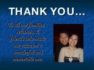 The document thanks family and friends for making their vacation wonderful and memorable. It expresses gratitude to the author's grandmother for her faithfulness and blessings. Thanks are also given to immediate family for their support. The document closes with a prayer from Psalm 20:1-5 for God to answer when people are in distress, protect them, grant their requests, and make their plans succeed.
