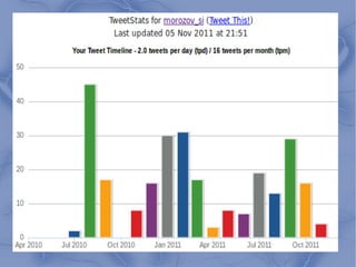 Документ обсуждает возможности использования Twitter как инструмента для государственно-общественных коммуникаций, подчеркивая длину твитов до 140 символов и наличие различных медиа. Основное внимание уделяется интерактивной коммуникации и эффективности ответов в зависимости от выбранной стратегии. Вывод заключается в том, что Twitter является перспективным каналом, который может расширить аудиторию с учетом других платформ, таких как VK.com.