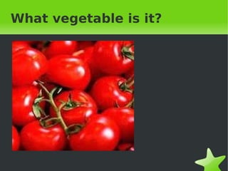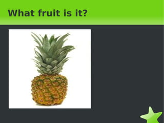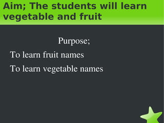 This document provides a lesson on fruits and vegetables for students. It aims to teach students the names of different fruits and vegetables. Examples of fruits like banana, strawberry, kiwi, apple, and pineapple are given along with questions asking what each fruit is. Examples of vegetables like tomatoes and cabbage are also provided with identifying questions. The purpose is to help students learn the names of various fruits and vegetables.