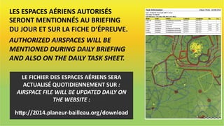 This document contains information for pilots regarding an airfield map, including anticollision markings, circling directions, landing patterns, observation zones, forbidden airspaces, reminders about the start line and daily briefings, as well as notes about radio checks and IGC files.