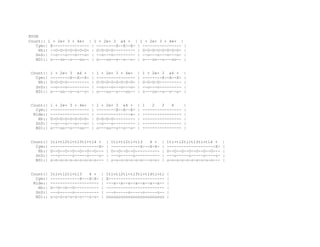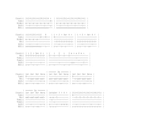 该文档包含复杂的计数和音乐符号组合,涉及多种音乐元素和节奏模式。每部分列出了不同的计数和乐器的交互,展示了音乐创作的多样性。文档结构化地呈现了这些信息,便于进一步分析和理解。