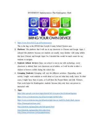 This BYOD/BYOT implementation plan for a kindergarten math classroom outlines the use of Chrome and Google Apps on tablets, accommodations for students without devices by using classroom sets, and grouping strategies including individual work, pairs, and larger groups. It also provides links to seven math and educational apps to be used.