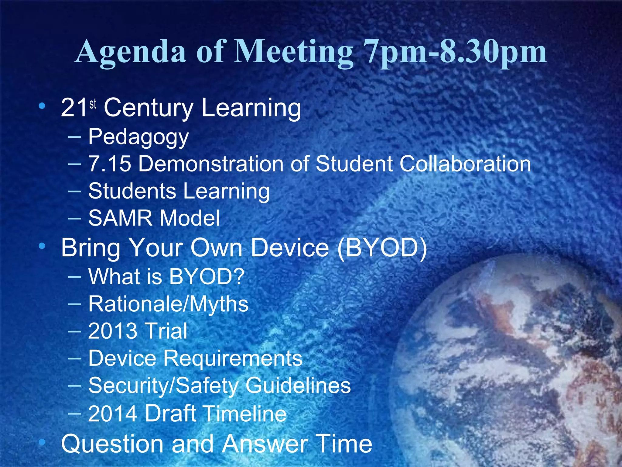 This document discusses bringing personal devices to school (BYOD). It begins with an agenda for a meeting on BYOD and 21st century learning. It then discusses pedagogical approaches and challenges with online assessments. The benefits of BYOD are outlined, including choice, accessibility, preparation for future learning. Common myths about BYOD are debunked. Minimum device requirements, safety guidelines, and a draft 2014 timeline for rolling out BYOD are also summarized.