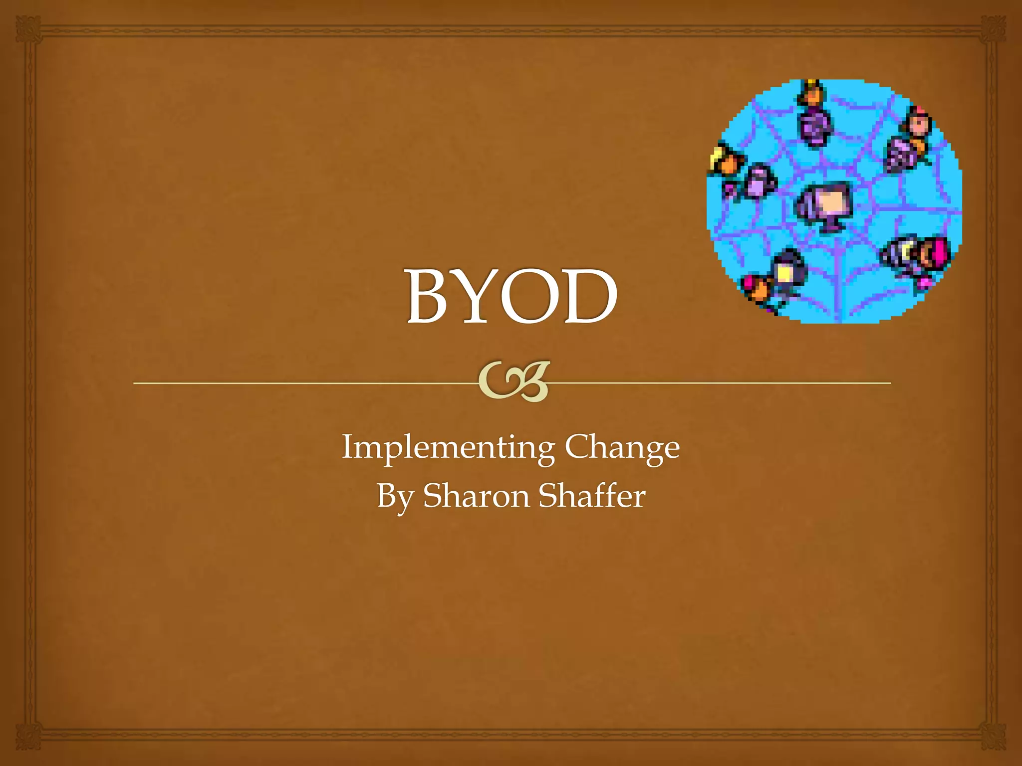 Implementing Change discusses bring your own device (BYOD) programs in schools. It provides arguments for and against BYOD as well as details about challenges and strategies for implementation. The document outlines Eric Willard's pyramid for successful BYOD implementation, which emphasizes leadership, funding, technology planning, infrastructure development, and curriculum support. Early reviews of BYOD programs have been positive according to teachers participating, but challenges include network capacity, safety, and access inequities.