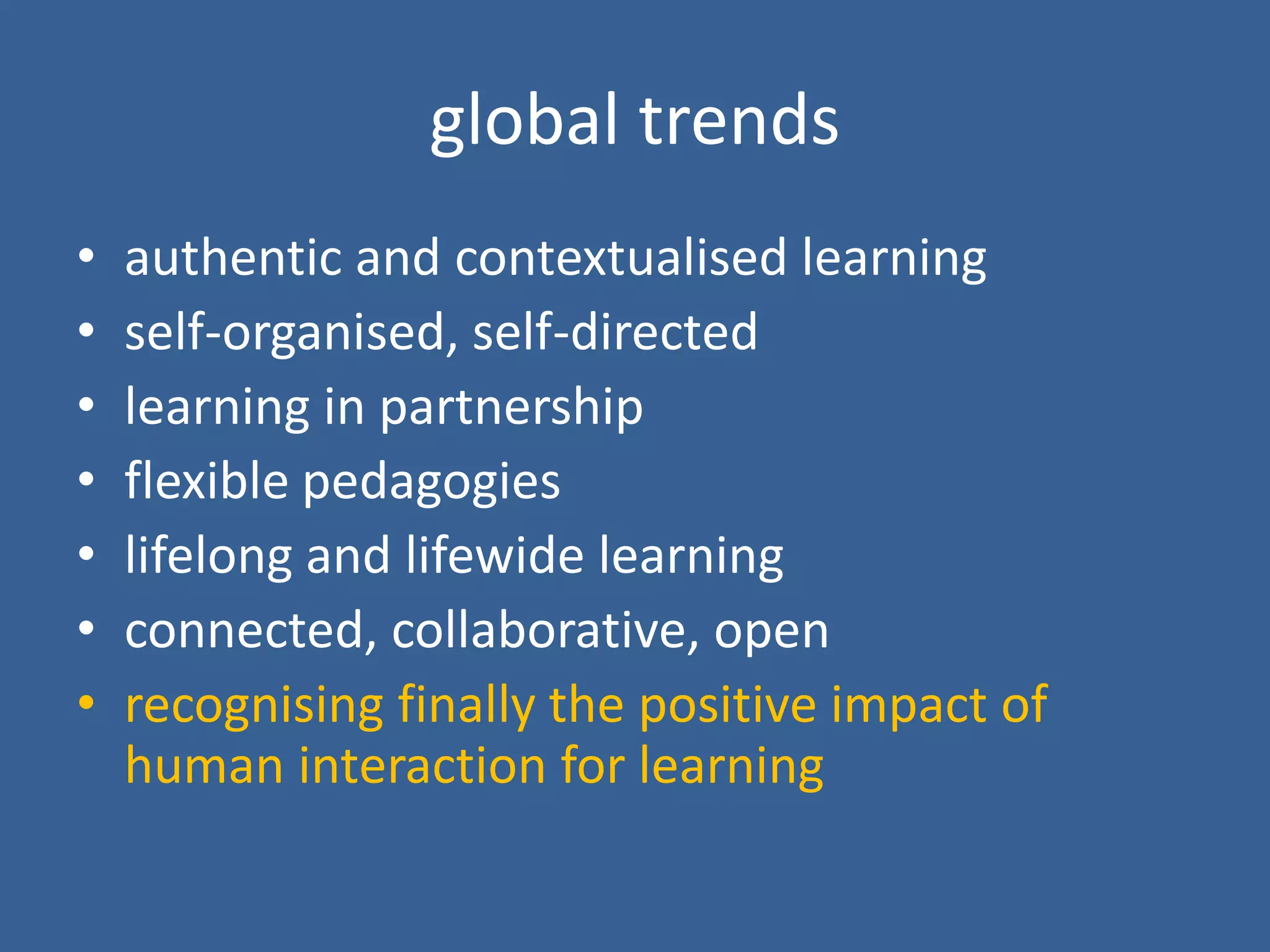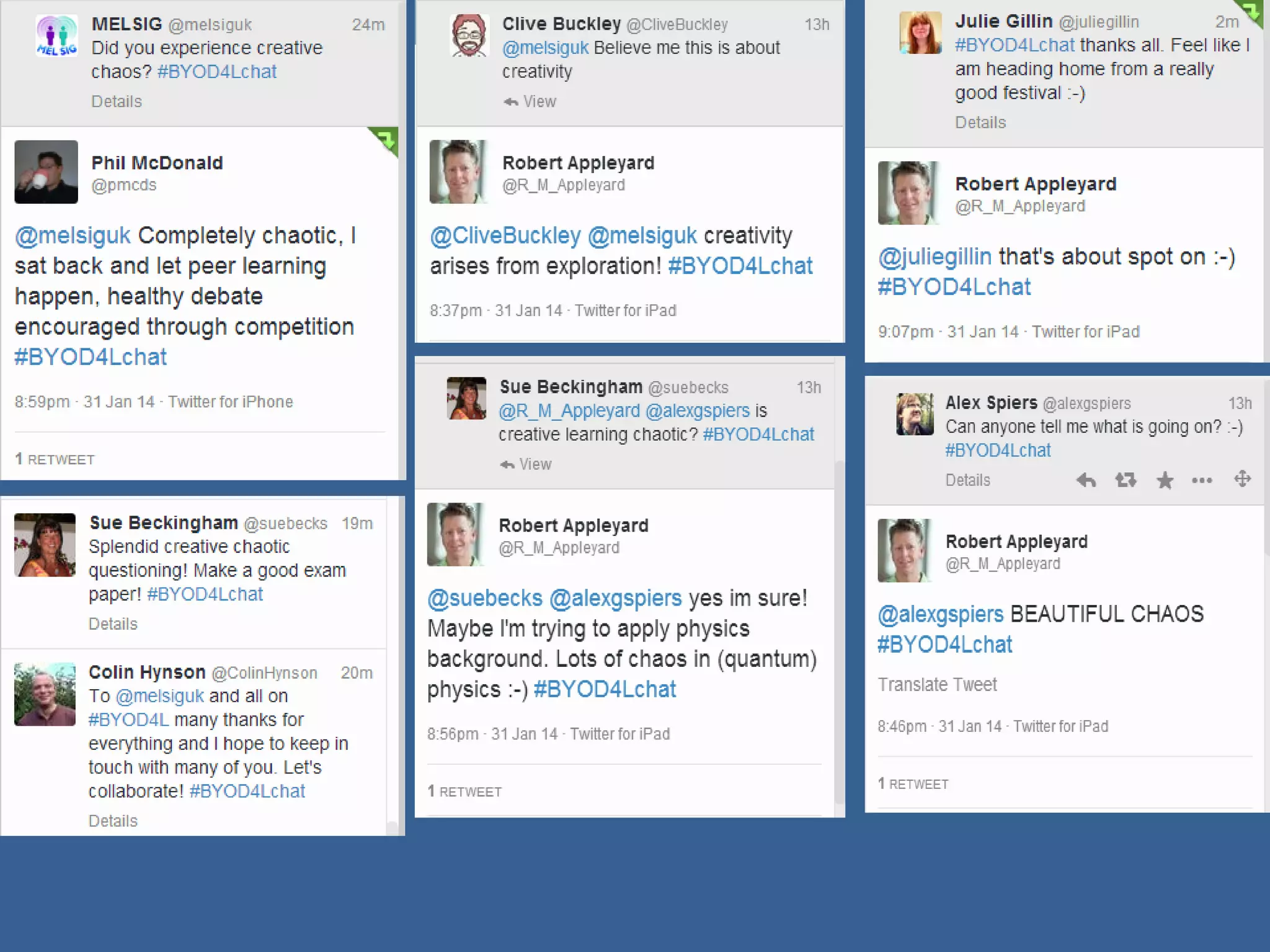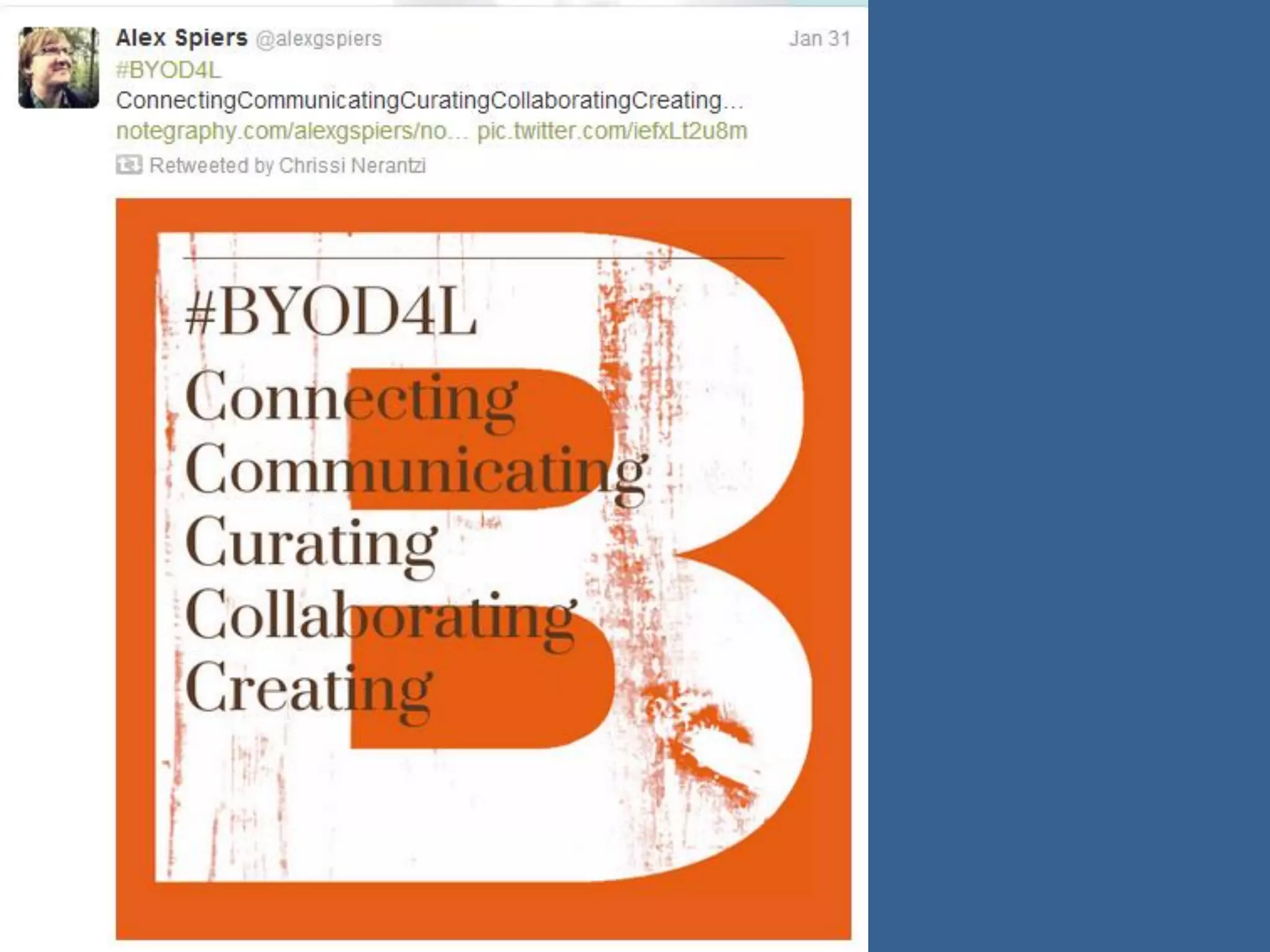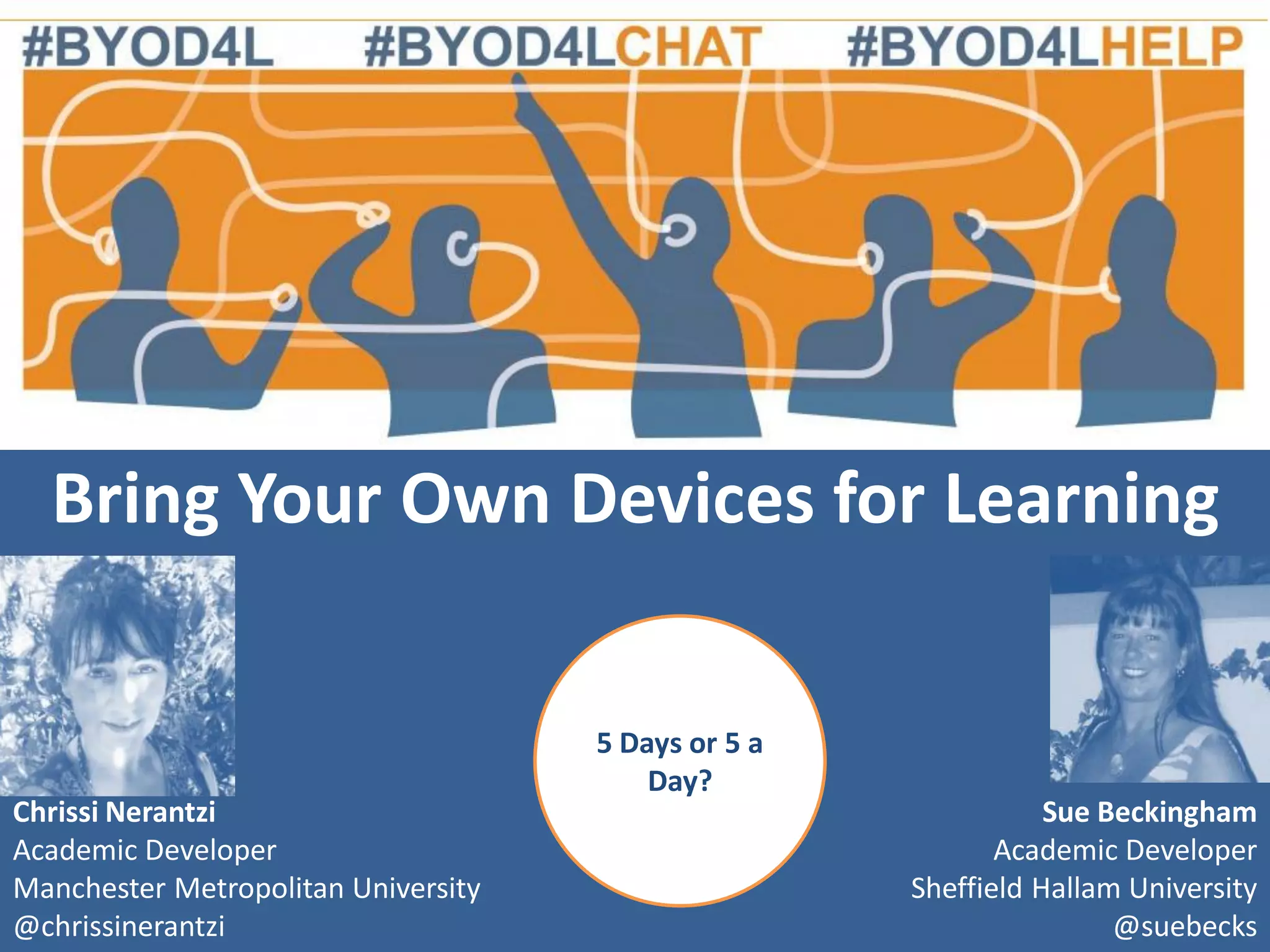 This document summarizes a 5-day online course called "Bring Your Own Devices for Learning" (BYOD4L). The course aimed to create an open learning environment where participants could learn from each other using their own devices. Each day focused on a different theme like connecting, communicating, curating, collaborating, and creating. Participants engaged in Twitter chats, blog posts, and other online activities. The course saw growing engagement over its 5 days as measured by website traffic and social media community growth. Organizers aim to continue the community through future events and evaluate ways to further develop open and collaborative learning.
