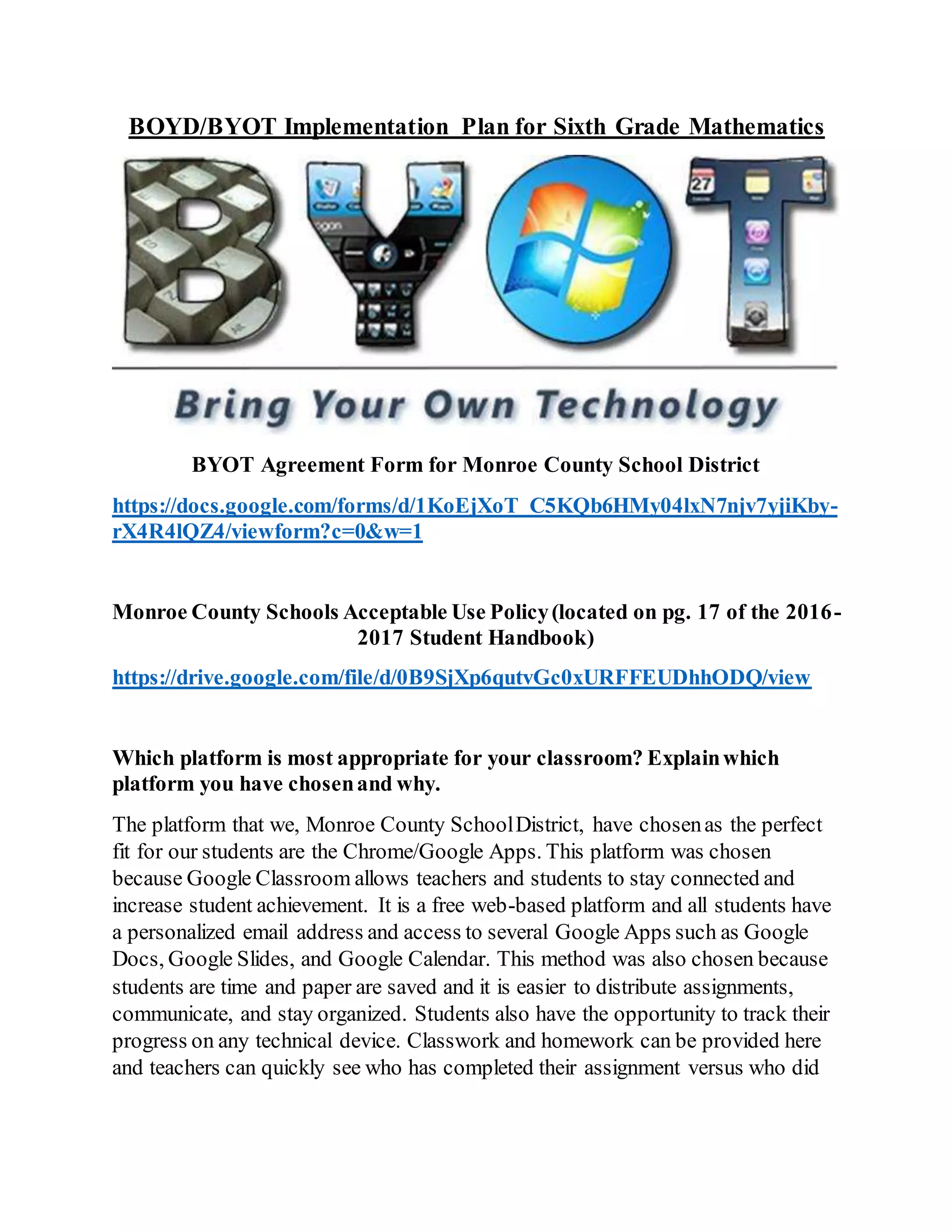 This document outlines a BYOT implementation plan for sixth grade mathematics in Monroe County School District, highlighting the selection of Google Classroom as the primary platform for its accessibility and efficiency in student engagement. It addresses provisions for students lacking personal devices and discusses various grouping strategies for assignments, emphasizing individualized work and collaboration for projects. Additionally, it lists several recommended educational apps for mathematics, including BrainPOP, Google Drive, and others, which facilitate learning through interactive resources and support multiple languages.