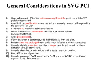 This document provides guidance on percutaneous coronary intervention (PCI) of saphenous vein grafts (SVGs). It notes that PCI of native coronary arteries is preferred when feasible. For SVG PCI, it recommends the liberal use of embolic protection devices to reduce the risk of atheroembolism. It also provides tips for technical considerations like guide catheter selection and balloon inflation pressures. It discusses the indications for and results of SVG intervention in different time periods after CABG, noting higher risks for early reintervention but short-term benefits of PCI over reoperation.