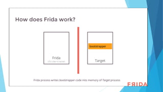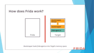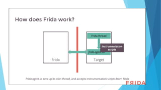 The document discusses the use of Frida, a dynamic instrumentation toolkit, for analyzing binaries and applications by bypassing security mechanisms like encryption, root checks, and SSL pinning. It highlights the advantages of using Frida over traditional code injection techniques, emphasizing its capability to inspect and instrument live processes across multiple platforms. The text provides insights on how to hook functions and modify application behavior at runtime using Frida's JavaScript API and various bindings.