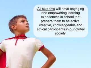 The document outlines goals for using technology to improve education, including giving students engaging learning experiences, using data to provide feedback for continuous improvement, and supporting educators with resources and expertise to enable effective teaching for all learners. It also aims to provide infrastructure and support for a 21st century learning environment, and to improve communication through technology between schools and their communities.