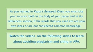 This document discusses citing sources in research papers to avoid plagiarism. It provides links to three tutorial videos that cover how to: 1) cite sources within the body of a paper, 2) create citations for journal articles in a reference list using APA style, and 3) use information ethically when contributing to a field of scholarship. It also lists features of the APA Style CENTRAL database and notes that Lynda.com tutorials are available through the library to help with writing skills.