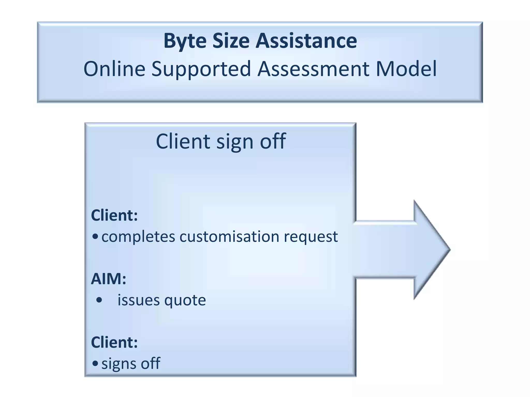 This document outlines the process for an online assessment model provided by Byte Size Assistance. It involves 4 key phases: 1) Client sign off on a quote for customization, 2) Preparation of customized wiki pages and templates, 3) A 6-week assessment period where participants post responses and evidence online and receive feedback, and 4) A completion phase where results are analyzed and participants are notified of outcomes. The goal is to provide a collaborative online environment for assessment.