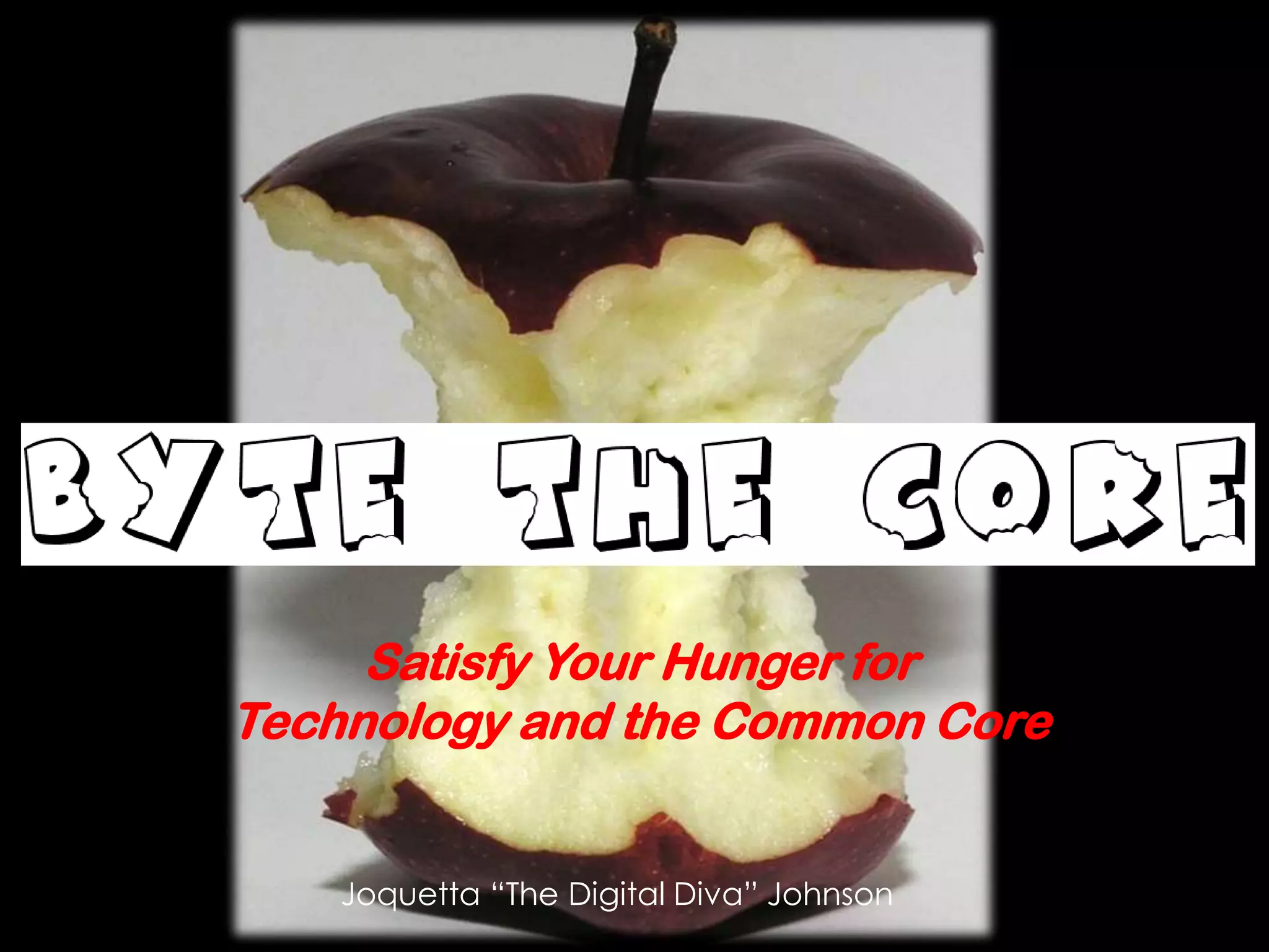 This document summarizes Joquetta "The Digital Diva" Johnson's presentation on satisfying hunger for technology and the Common Core. The presentation discusses how the Common Core requires students to conduct research, analyze a variety of print and non-print texts, and use technology thoughtfully to enhance reading, writing, speaking, listening and language skills. It provides links to resources like apps, websites and tutorials that teachers and students can use to develop vocabulary and digital literacy skills aligned with Common Core standards. Examples are given of how students used various digital tools and platforms like Edmodo, Flip cameras and iPads in school projects.