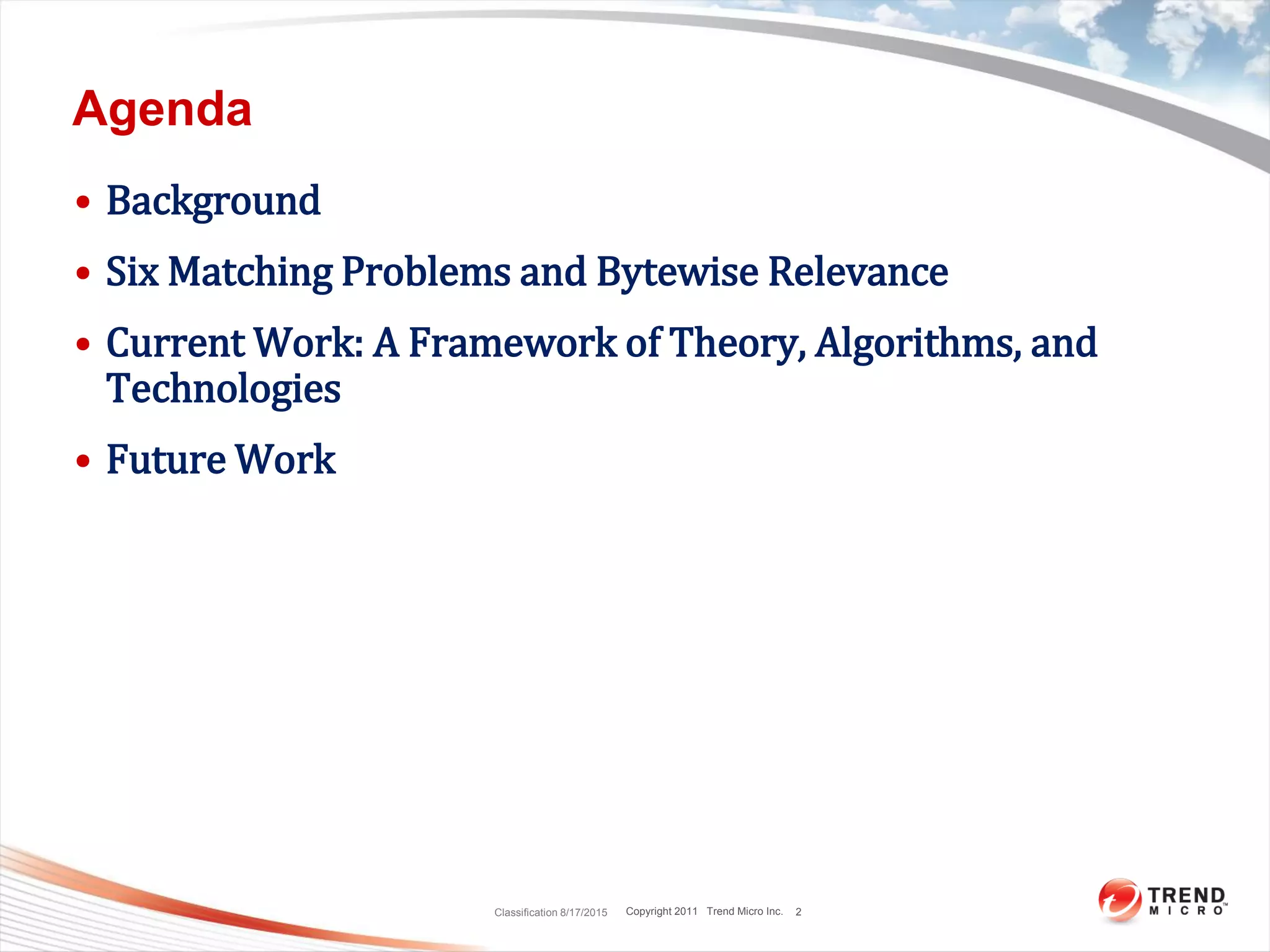This document discusses bytewise approximate matching, searching, and clustering. It defines six matching problems - identicalness, containment, cross-sharing, similarity, approximate containment, and approximate cross-sharing. A framework is proposed that uses bytewise relevance to define matching, searching, and clustering problems and solutions. Current and future work includes algorithms, tools, and applications for approximate matching in domains like malware analysis, plagiarism detection, and digital forensics.