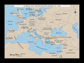 Byzantine art developed after Constantine moved the capital of the Roman Empire to Constantinople in the 4th century. Art was primarily created for the Eastern Orthodox Church and featured somber, flat figures in mosaics and paintings with little realism. Iconoclasm prohibited depicting people from 726 to the 9th century. Sculpture was limited to ivory book covers. Major works included the Hagia Sophia and mosaics at Ravenna and the Kiev catacombs that depicted biblical and theological themes through the 15th century fall of Constantinople.