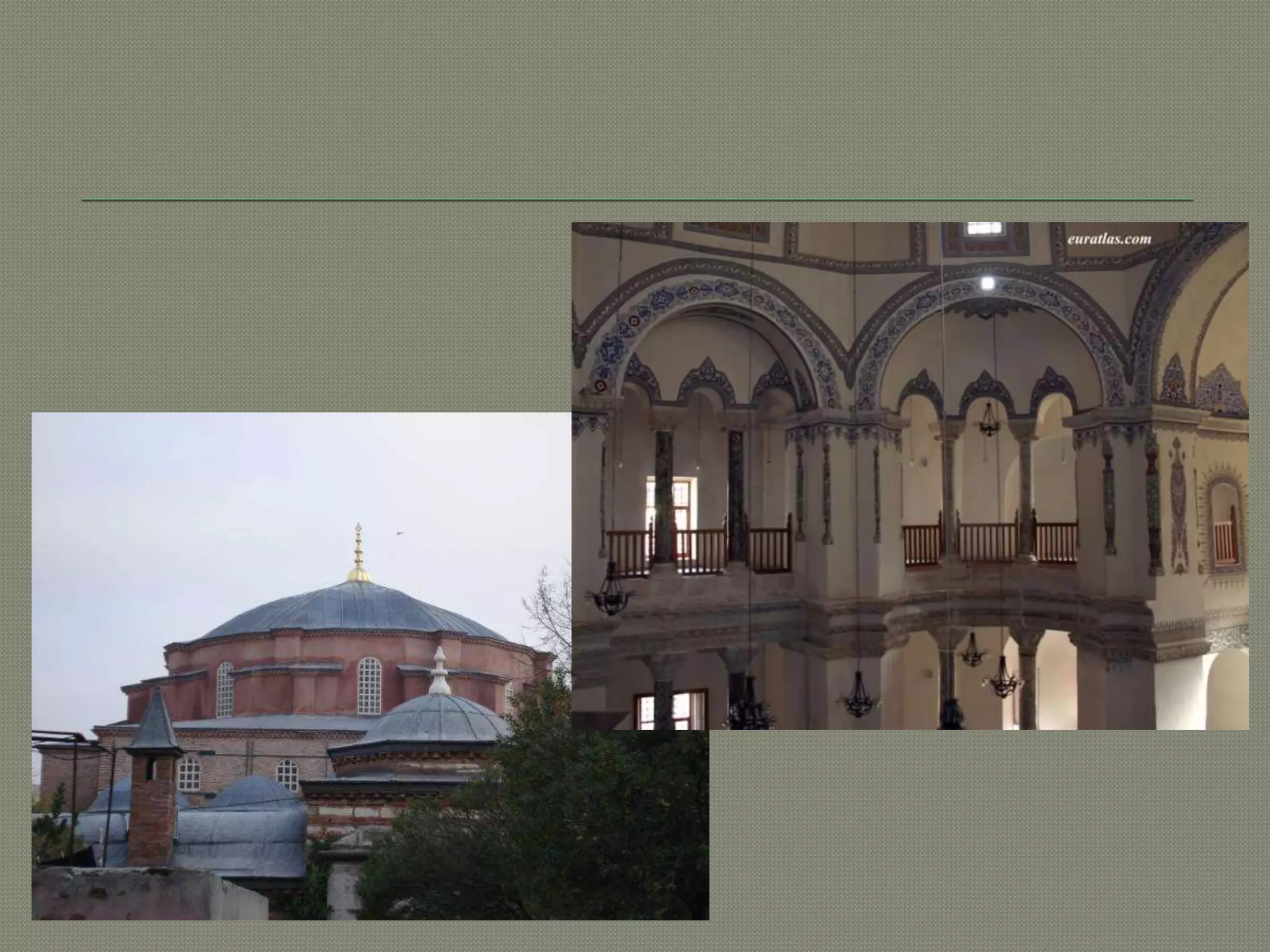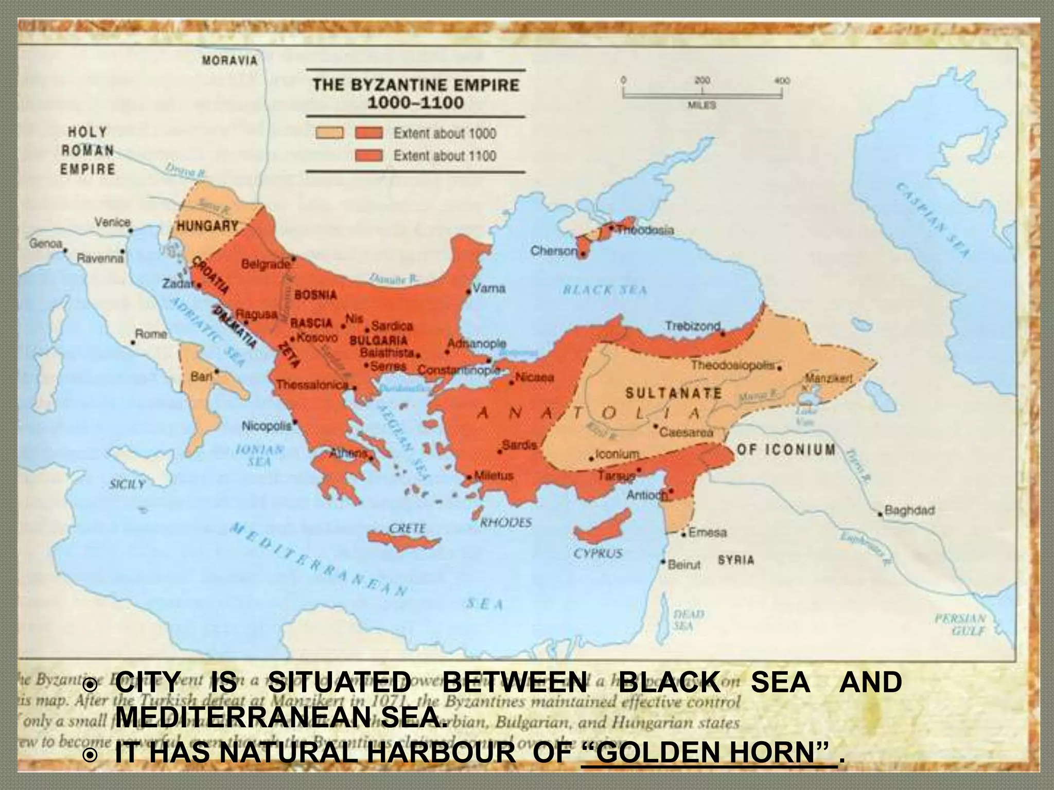 The early Greek settlers of Byzantium were led by Byzas, who gave his name to the city. Byzantium was strategically located between the Black Sea and Mediterranean with a natural harbor of the Golden Horn. The Byzantine style of architecture used lime concrete, bricks, marble, mosaics, and domes supported by pendentives. Two important early examples are the 6th century Church of Sergius and Bacchus in Istanbul, with its 15.8 meter diameter dome on pendentives, and Hagia Sophia in Istanbul, known for its massive central dome supported by semi-domes and exedrae.