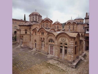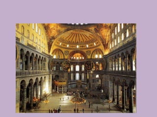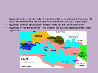 Byzantine art developed out of eastern Roman imperial art and reflected Christian religious themes. It utilized styles like mosaics, icons, and illuminated manuscripts. Major artistic periods included the Early Byzantine era featuring works like the Hagia Sophia and mosaics of Justinian and Theodora, the Iconoclastic controversy which banned religious images, and the Middle Byzantine period when icons were restored. Art was used to convey religious messages and assert political power in monumental church buildings and luxurious objects.