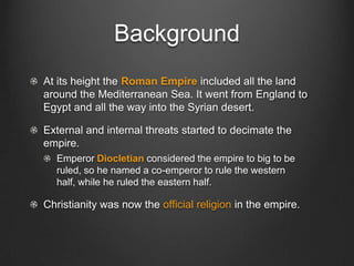 The document provides background information on the Byzantine Empire. It describes how the Roman Empire was originally centered around the Mediterranean but faced internal and external threats over time. Emperor Diocletian divided the empire into western and eastern halves to make it easier to govern. Constantine later moved the capital to Constantinople in Turkey. The western half of the empire continued to decline due to invasions, while the eastern half grew stronger under emperors like Justinian who reconquered territory and standardized the legal system. The Byzantine Empire had Constantinople as its capital and spoke Greek, with Orthodox Christianity becoming its dominant religion.