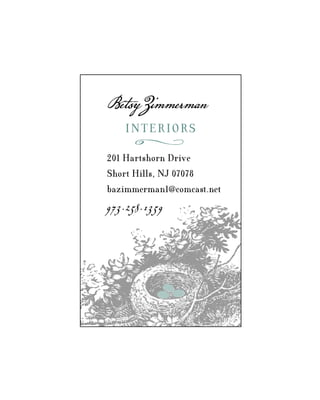 Betsy Zimmerman operates an interior design business called BetsyZimmerman Interiors located at 201 Hartshorn Drive in Short Hills, New Jersey. She can be contacted via email at bazimmerman1@comcast.net or by phone at 973.258.1359.