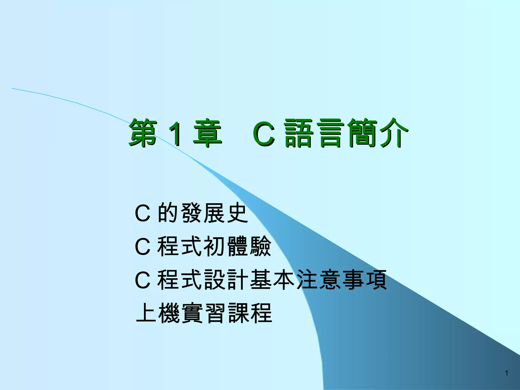 第 1 章 C 語言簡介 C 的發展史 C 程式初體驗 C 程式設計基本注意事項 上機實習課程