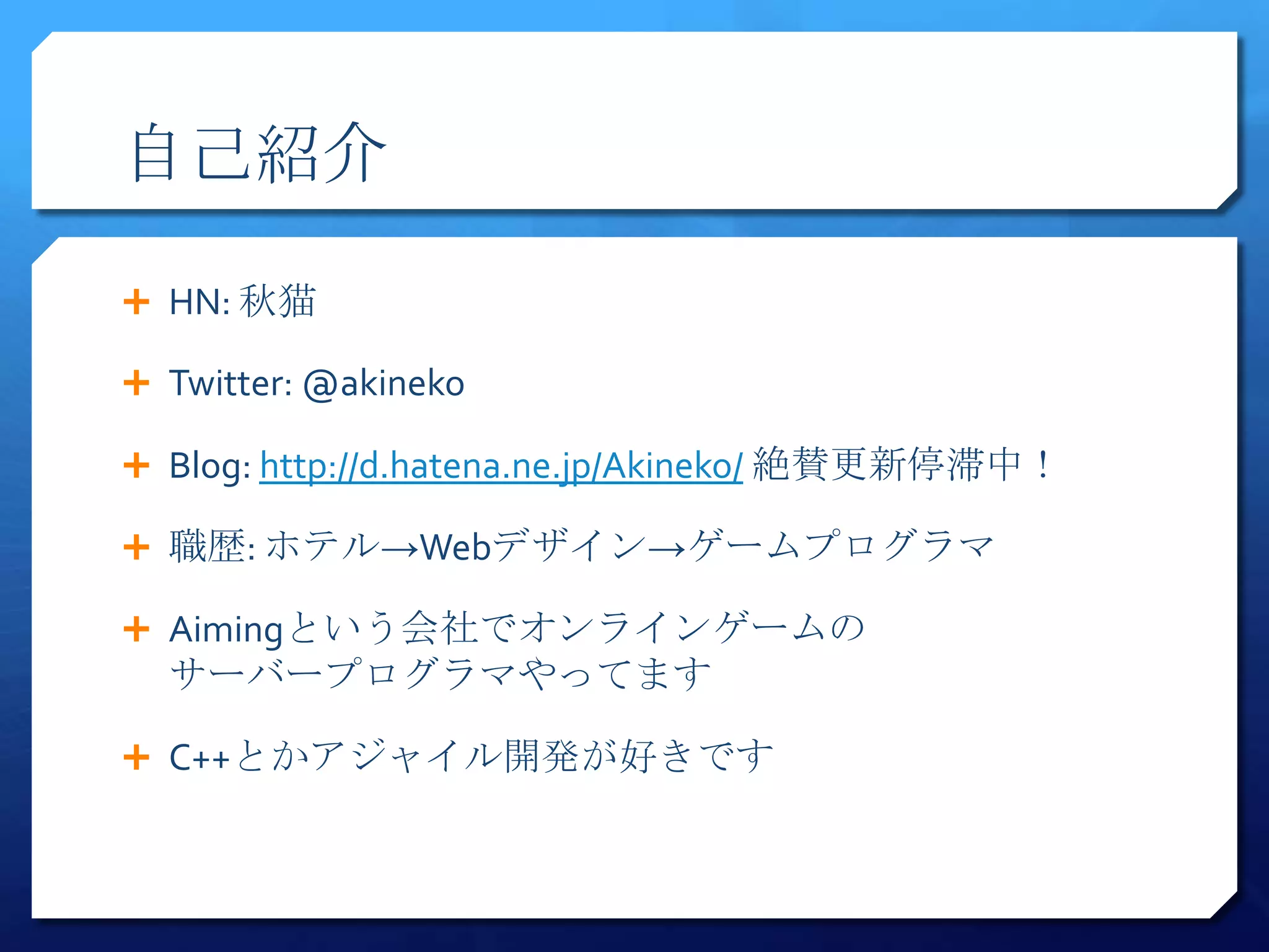 Blog: http://d.hatena.ne.jp/Akineko/ 絶賛更新停滞中!