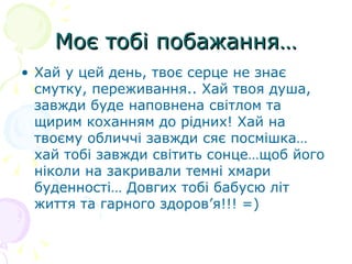 Моє тобі побажання…Хай у цей день, твоє серце не знає смутку, переживання.. Хай твоя душа, завжди буде наповнена світлом та щирим коханням до рідних! Хай на твоєму обличчі завжди сяє посмішка…хай тобі завжди світить сонце…щоб його ніколи на закривали темні хмари буденності… Довгих тобі бабусю літ життя та гарного здоров ’ я!!! =)