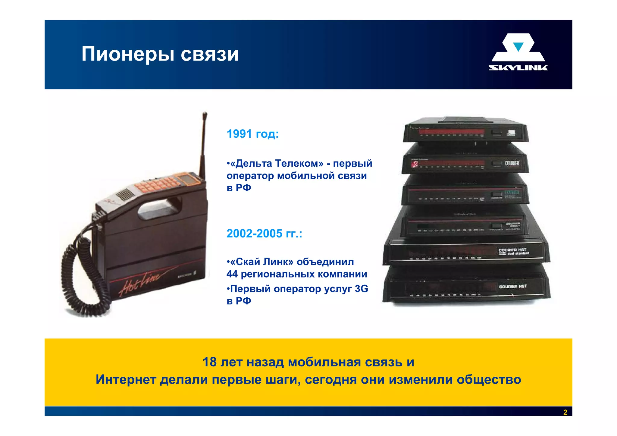 Документ описывает создание единого оператора «Скай Линк» и его развитие как первого оператора 3G и мобильного интернета в России. В нем изложены ключевые достижения компании, включая реорганизацию корпоративной структуры, рост абонентской базы и значительное увеличение трафика мобильного интернета. Также подчеркивается важность мобильного интернета для преодоления цифрового неравенства в стране.