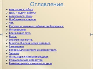 Документ представляет собой исследование сетевой коммуникации, включая различные средства взаимодействия, такие как чаты, социальные сети и электронную почту. Обсуждаются цели и задачи работы, актуальность темы, а также преимущества и недостатки общения через интернет. Также содержится информация о популярных платформах и типах сетевых коммуникаций, таких как ip-телефония и блоги.