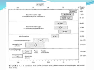 2) Different types of carbon atoms (CH, CH2, CH3) can be distinguished based on their chemical shifts and coupling patterns. Proton decoupling is used to simplify spectra.