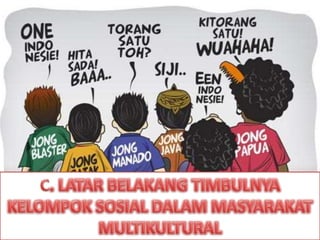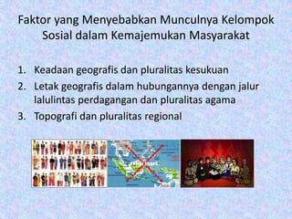 Dokumen ini menjelaskan faktor-faktor yang menyebabkan terbentuknya kelompok sosial dalam masyarakat yang majemuk di Indonesia, termasuk keadaan geografis, pluralitas agama, dan regional. Selain itu, dijelaskan karakteristik masyarakat majemuk yang sering mengalami konflik dan kurang mengembangkan konsensus, serta faktor pemecah yang mempertajam pembatasan antar suku bangsa. Penyebaran agama dan interaksi sejarah juga berkontribusi pada dinamika sosial di Indonesia.