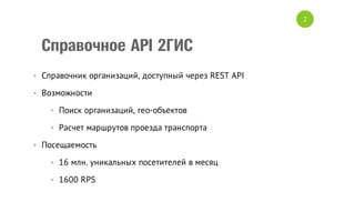 Документ описывает архитектуру справочного API 2ГИС, включая его ключевые функции, такие как поиск организаций и расчет маршрутов. Он подчеркивает три основных принципа, на которых основана архитектура: отказоустойчивость, обновление данных и ускорение веб-приложения. Кроме того, охватывается мониторинг производительности и оптимизация веб-приложения с использованием различных технологий и инструментов.