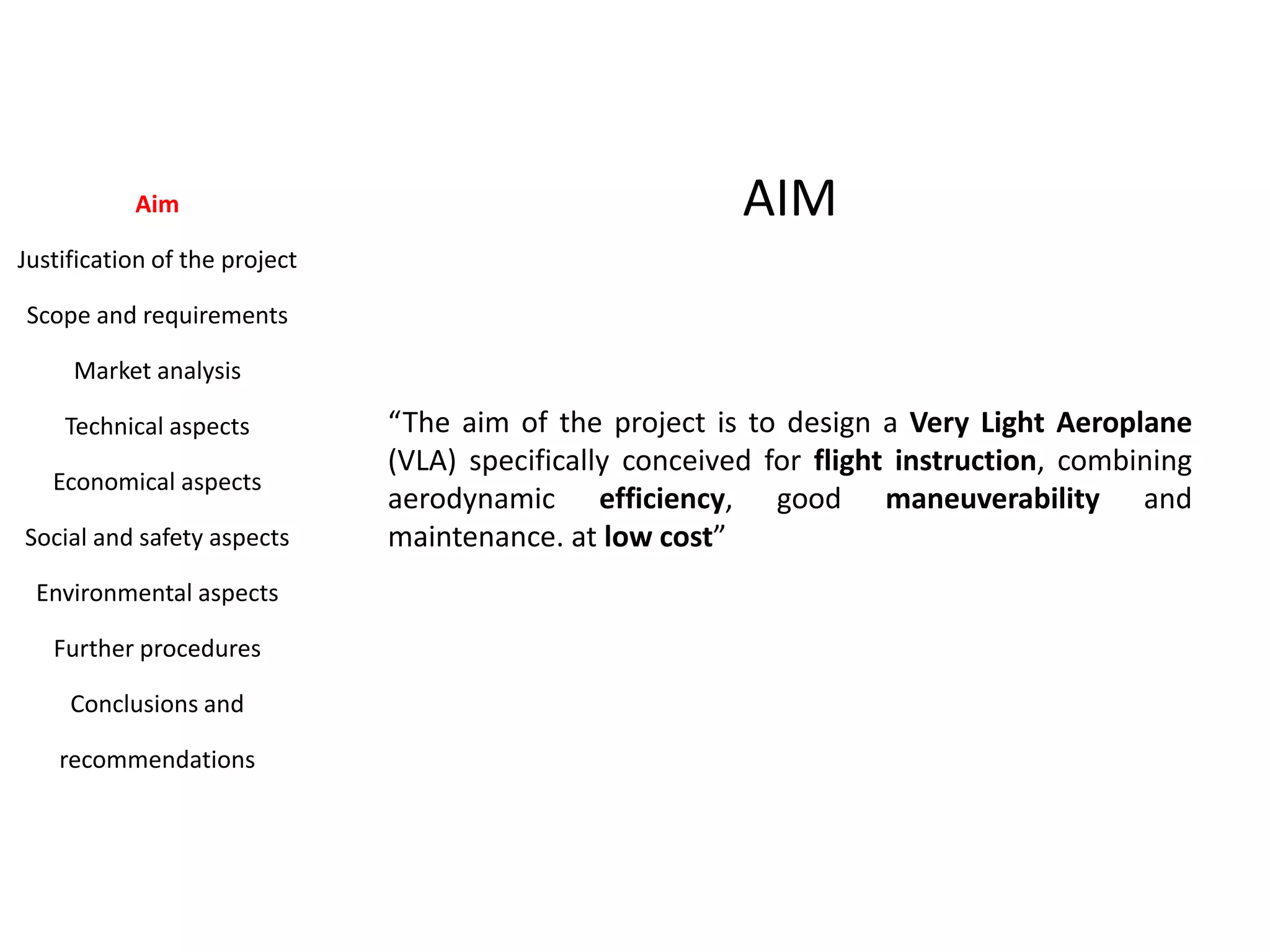 The document outlines the contents and sections of a project to design a very light aeroplane (VLA) for flight instruction. The sections include the aim, justification, scope and requirements, market analysis, technical, economic, social and environmental aspects, further procedures, and conclusions and recommendations. The overall aim is to design a VLA that combines aerodynamic efficiency, good maneuverability, and low maintenance costs for flight instruction purposes.