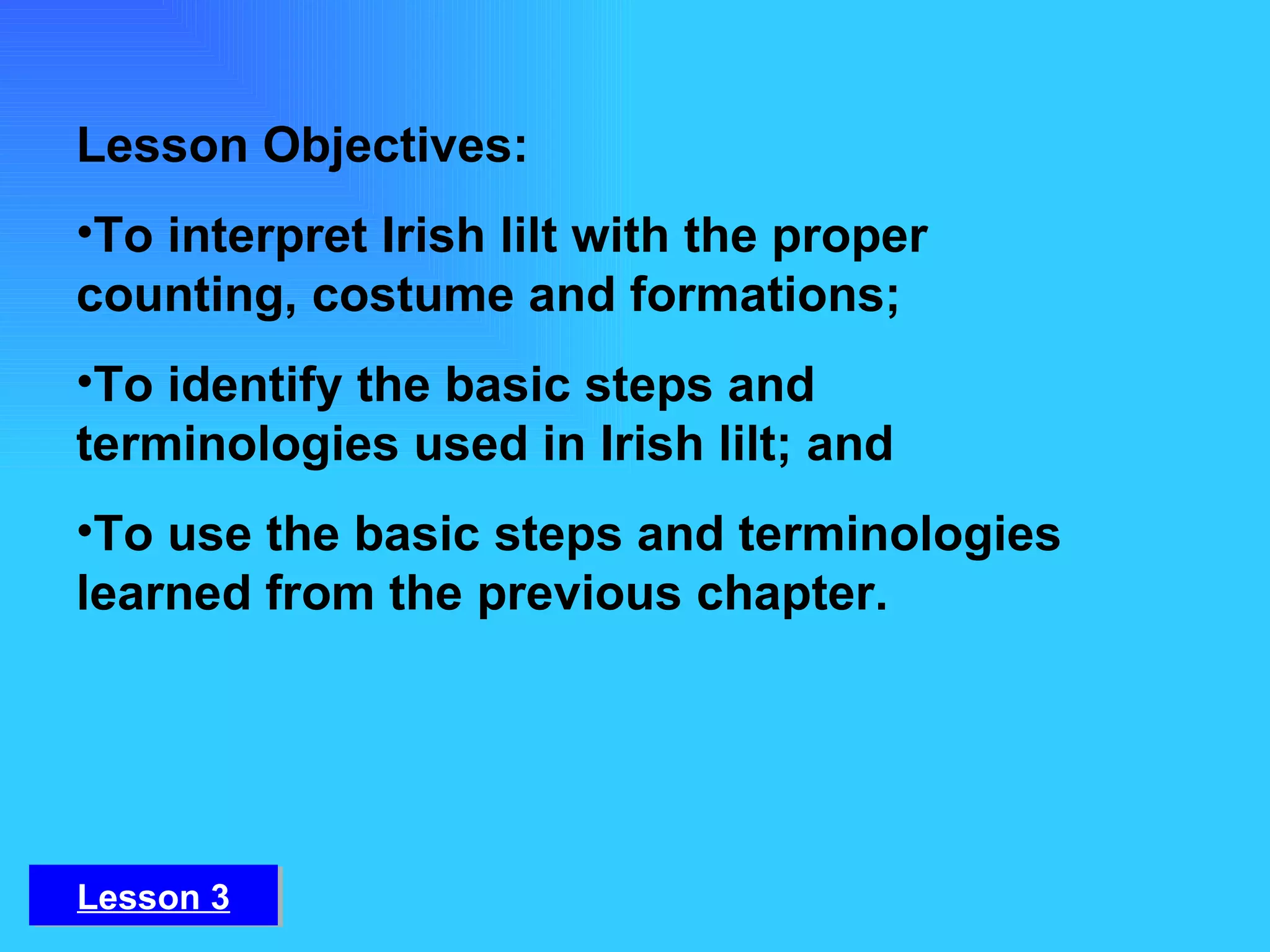 This document provides instructions for performing an Irish dance called the Irish Lilt. It describes the costume as an emerald green blouse and dark skirt for girls. It outlines 6 figures or moves to the dance including rocking steps, kicks, toe and heel touches, leg twists, side steps, and kicks with changes of feet. Each move is explained in detail with the specific foot placements and motions over the course of the music, which is composed of 16 measure phrases.