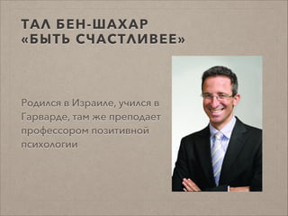 Документ обсуждает концепцию счастья и профессионального развития, основываясь на идеях Тал Бен-Шахара. Он рассматривает различные архетипы, связанные с жизненными целями и счастьем, такие как гедонизм и нигилизм. Основная формула счастья представлена как сумма наслаждения и смысла, с акцентом на важность целей в жизни.