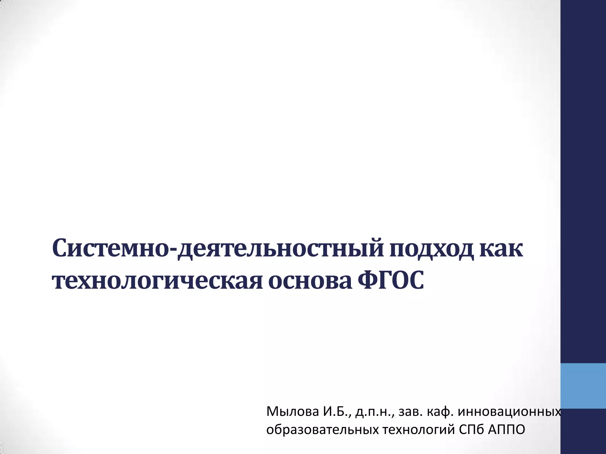 Документ описывает системно-деятельностный подход как методологическую основу современных образовательных стандартов, акцентируя внимание на целенаправленной, мотивированной и саморегулируемой деятельности учащихся. Подход предполагает организацию учебного процесса, в которой приоритет отдается деятельности учеников, их самостоятельному обучению и применению полученных знаний на практике. Основные этапы включают проектирование учебных ситуаций, исследования и развитие универсальных учебных действий.