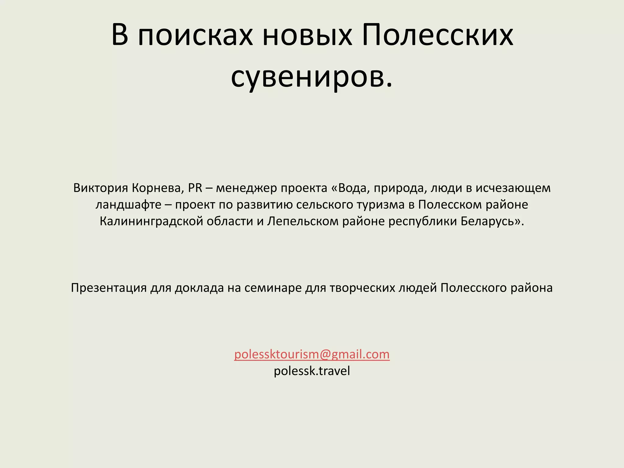 Документ посвящен развитию сувенирной продукции в контексте сельского туризма в Полесском районе. Обсуждаются различные категории сувениров, включая пищевые подарки, текстиль и изделия местного ремесла, а также их исторические корни и современные тенденции. Приводятся идеи для новых сувениров и ссылки на ресурсы для поиска вдохновения.