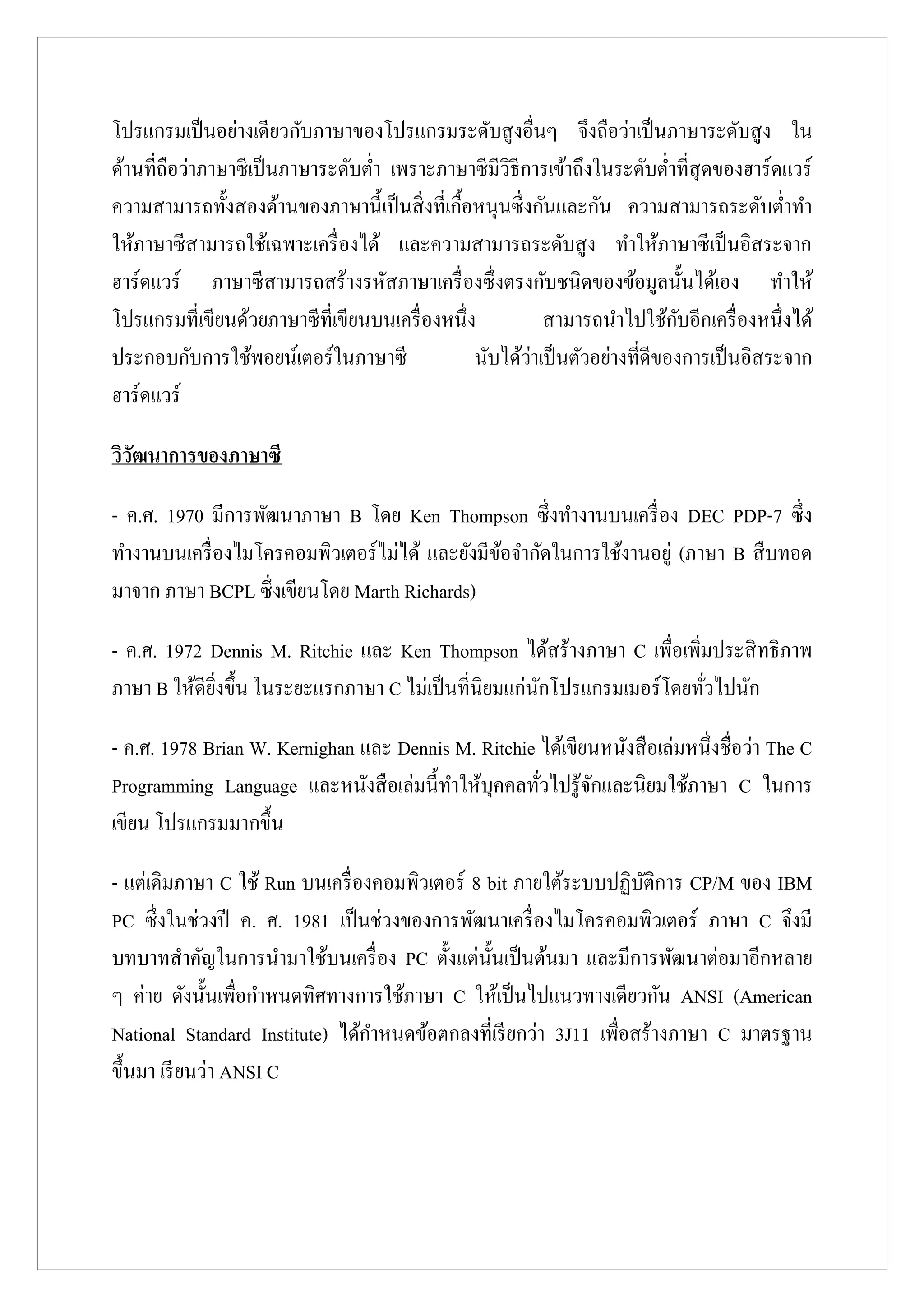 - ค.ศ. 1978 Brian W. Kernighan และ Dennis M. Ritchie ได้เขียนหนังสือเล่มหนึ่งชื่อว่า The C Programming Language และหนังสือเล่มนี้ทาให้บุคคลทั่วไปรู้จักและนิยมใช้ภาษา C ในการ เขียน โปรแกรมมากขึ้น