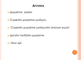 жишээ Дидактик шийдэл Дидактик материал Дидактик орчин Дидактик арга Дидактик зорилго Дидактик бодлого