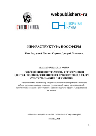 Исследовательская работа посвящена современным инструментам регистрации и идентификации произведений в сфере культуры, науки и образования, акцентируя внимание на возможности внедрения системы идентификации для упорядочивания правового статуса знаний и культурных ценностей. В документе рассматриваются стратегии идентификации, включая выбор идентификатора DOI, и обсуждаются вопросы финансирования создания реестра сиротских произведений. Также анализируются проблемы открытого доступа к знаниям и культурным ценностям, подчеркивая важность создания системы стимулов для авторов.