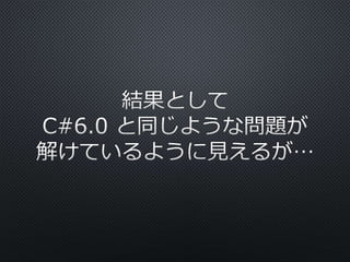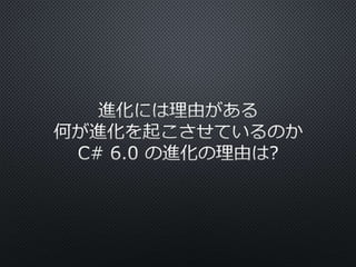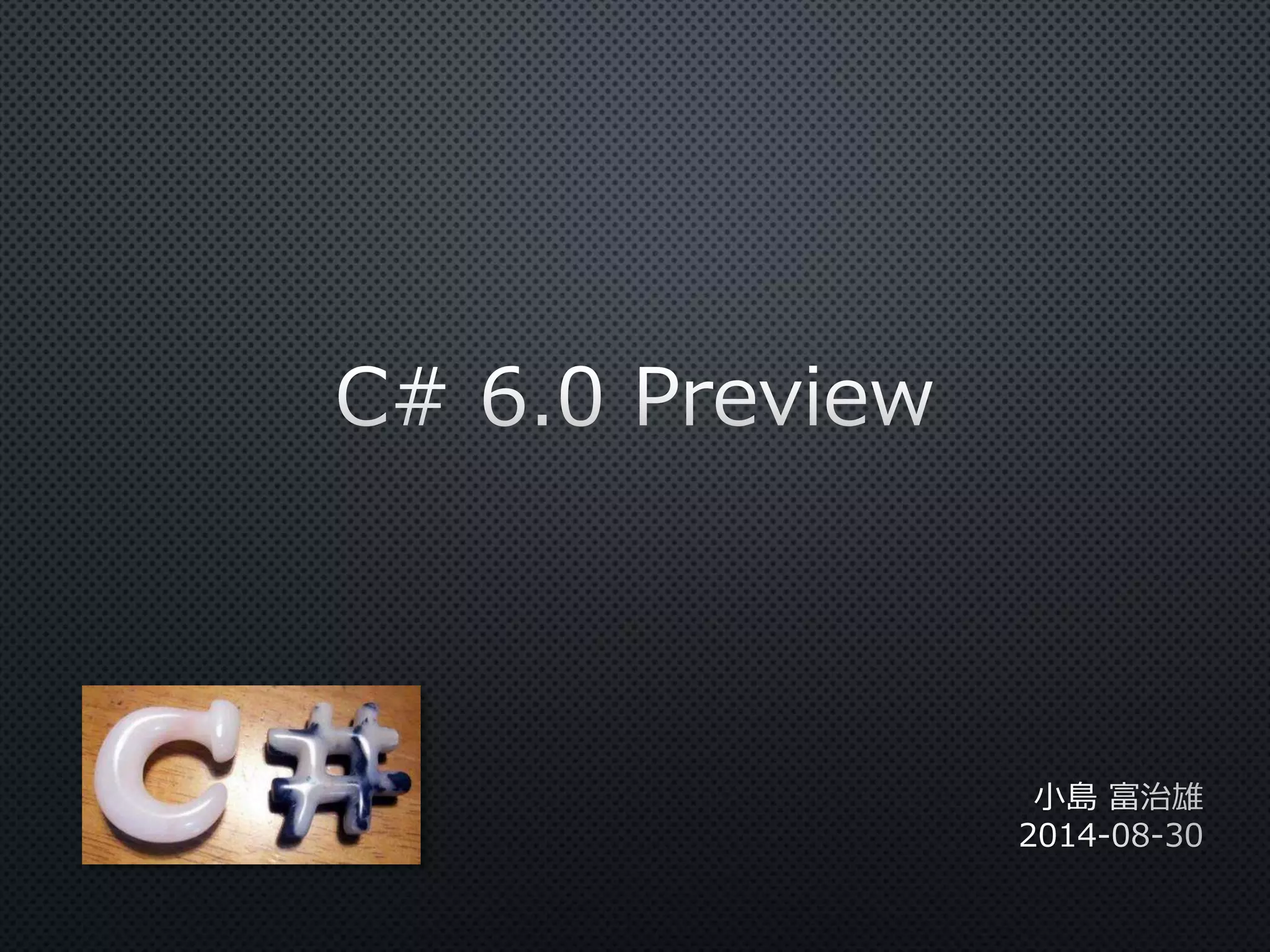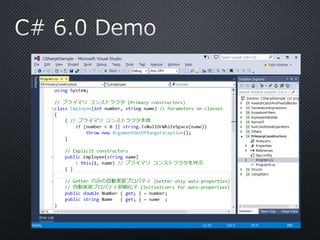 The document discusses various features of C# programming language, including the evolution from C# 1.0 to C# 6.0, highlighting functionalities like primary constructors, auto-property initializers, and the Roslyn compiler platform. It includes examples demonstrating these features and mentions future planned capabilities. In addition to presenting code snippets, the text emphasizes improvements in static member access and error handling.